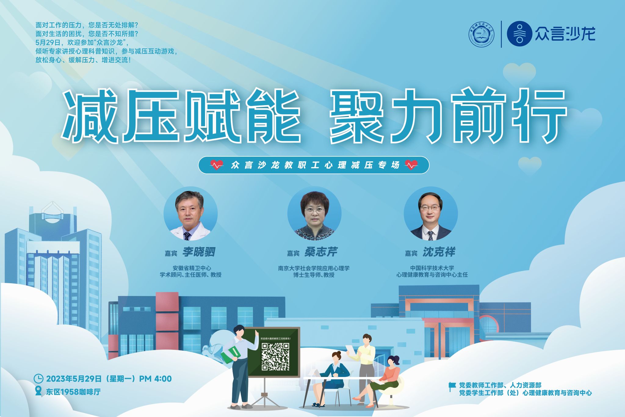 为进一步提升教职工的幸福感、获得感和归属感,加强对教职工的人文关怀和心理疏导,“众言沙龙”将举办教职工心理减压专场活动,邀请心理健康教育与咨询中心开放教职工心理咨询渠道,缓解教职工工作和生活压力。